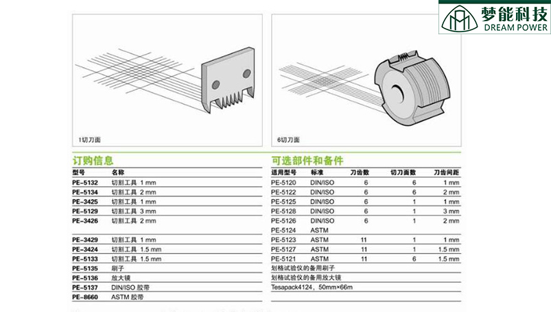 劃格法附著力測試標(biāo)準(zhǔn)主要有ASTMD3359、ISO-2409和GB9286-98。其測試方法和描述基本相同,只是對于附著力級別的說明次序剛好相反。ASTMD3359是5B-OB級由好到壞,而ISO-2409是0-5為由好到壞。實(shí)驗工具是劃格測試器,它是具有6個切割面的多刀片切割器,切刀間隙1mm、2mm和3mm(刀頭可以更換)。將試樣涂于樣板上,干燥16小時后,用劃格器平行拉動3-4cm,有六道切痕,應(yīng)切穿漆膜至底材;然后用同樣的方法與前者垂直,切痕同樣六道;這樣形成許多小方格。對于軟底材,用軟毛刷沿網(wǎng)格圖形成每一條對角線,輕輕向前和后各掃幾次,即可評定等級;而對于硬質(zhì)底材,先清掃,之后貼上膠帶(一般使用3M膠帶),且要保證膠帶與實(shí)驗區(qū)全面接觸,可以用手指來回摩擦使之接觸良好,然后迅速拉開,使用目視或者放大鏡對照標(biāo)準(zhǔn)與說明附圖進(jìn)行對比定級。其分級的標(biāo)準(zhǔn)描述為: