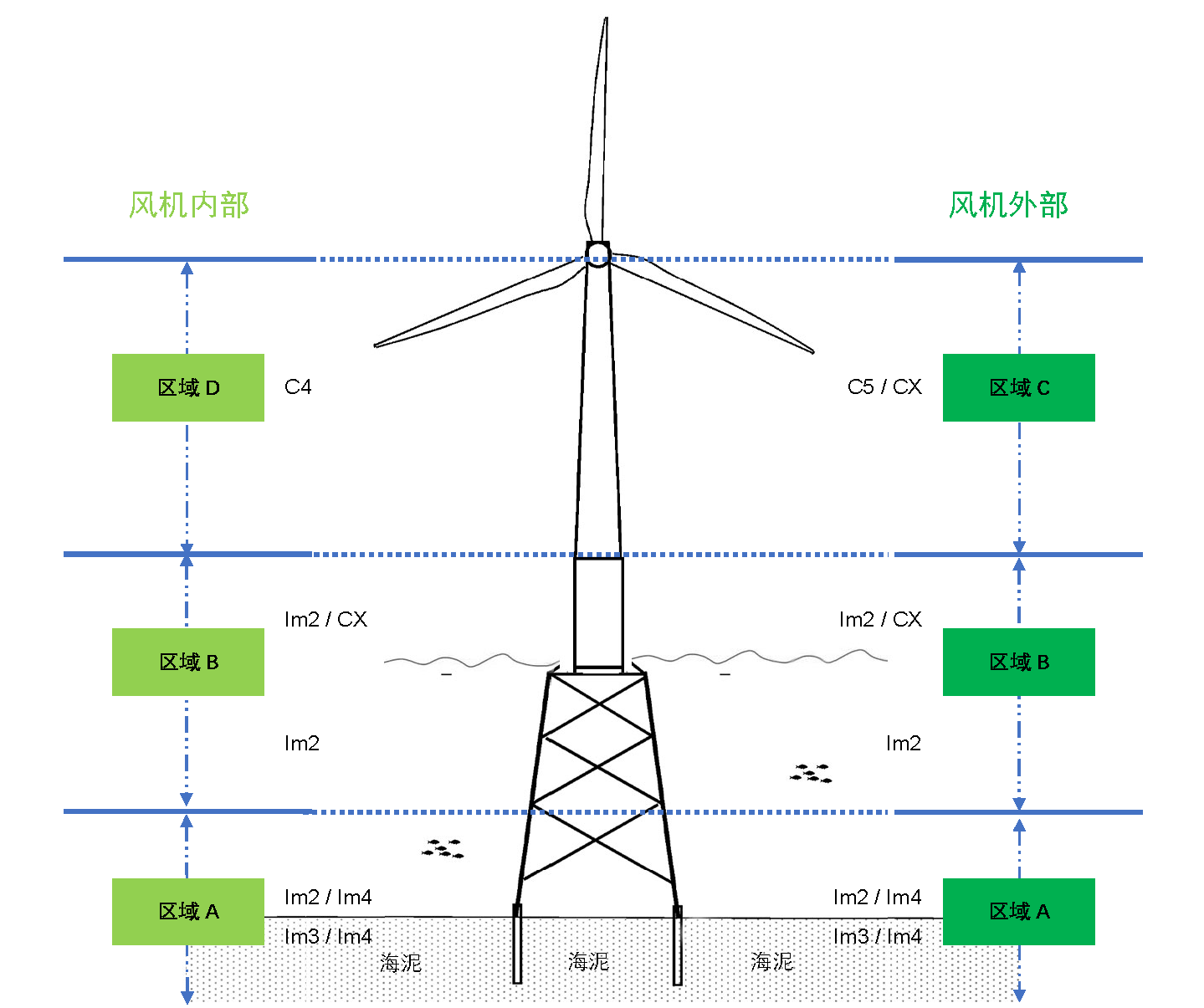 海上風(fēng)電的腐蝕環(huán)境較為嚴(yán)酷,其腐蝕區(qū)域可分為:海洋大氣區(qū)、浪濺區(qū)、潮差區(qū)、海水全浸區(qū)和海泥區(qū),風(fēng)電機(jī)組。