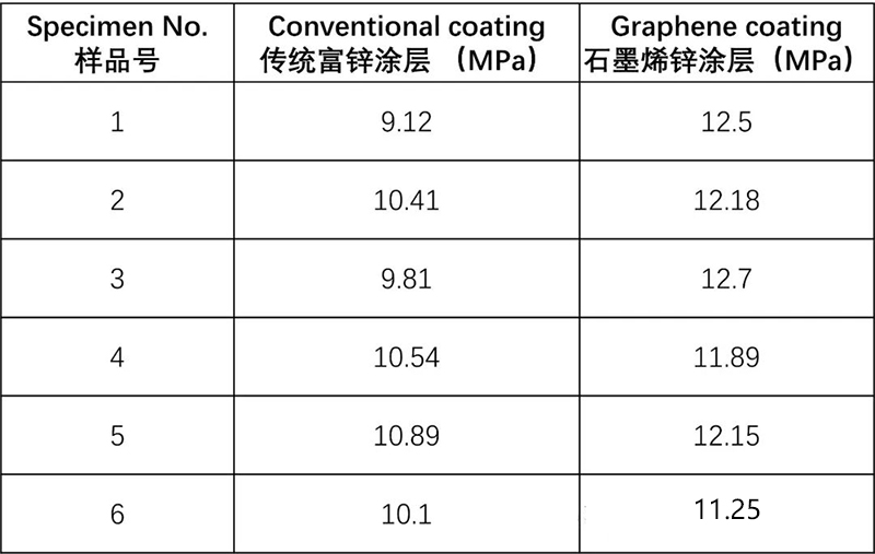 表1示出了6組常規(guī)涂層和石墨烯涂層的附著力。從表1中可以看出,石墨烯涂層的最大附著力達到了12.5 MPa,總體平均附著力則達到了12.1 MPa,明顯大于常規(guī)涂層10.2 MPa的平均附著力,平均附著力提升了約20%。