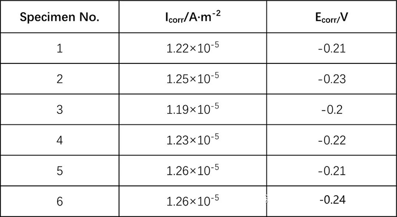 通過塔菲爾切線外延法得出6組常規(guī)涂層和石墨烯涂層的腐蝕電流(Icorr)和腐蝕電位(Ecorr),結果如表2和表3所示。從表中可以看出,常規(guī)涂層的腐蝕電流在2.05×10-4 A·m-2~2.62×10-4 A·m-2之間;而石墨烯涂層的腐蝕電流范圍為1.22×10-5 A·m-2~1.26×10-5 A·m-2,相比常規(guī)涂層,石墨烯涂層的腐蝕電流降低了一個數量級,同時其腐蝕電位也逐漸正移,表明石墨烯涂層的防腐效果較好。
