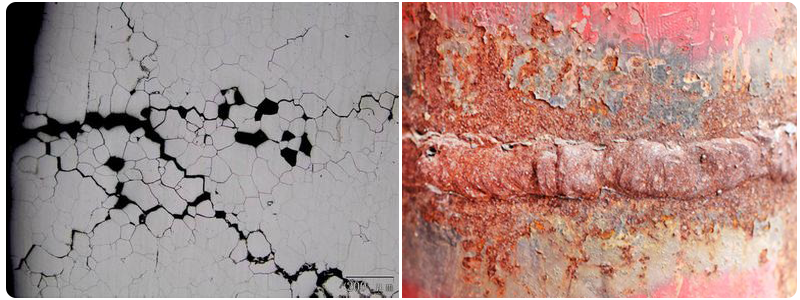 這種化學(xué)反應(yīng)使得材料中晶粒邊界處的鉻的含量減少,從而這些區(qū)域抗腐蝕的能力下降,同時(shí)這些區(qū)域還會(huì)與附近受到保護(hù)的合金形成原電池,從而高腐蝕性的環(huán)境中會(huì)產(chǎn)生焊縫腐蝕(焊接處晶粒邊界的腐蝕)。