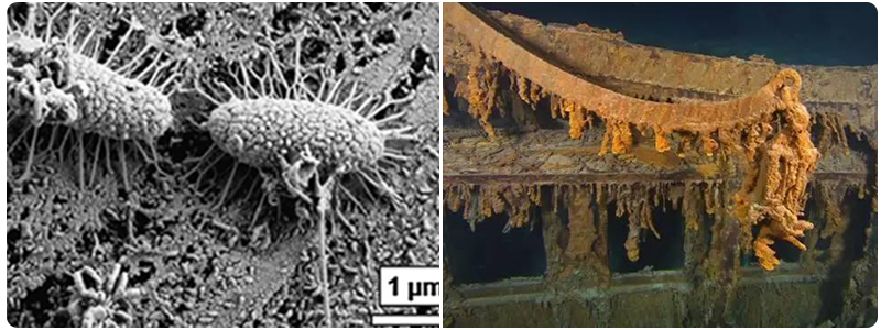 微生物腐蝕也叫做細(xì)菌腐蝕,是指由微生物(通常是化能生物)導(dǎo)致的腐蝕。這種腐蝕既可以發(fā)生在金屬上,也可以發(fā)生在非金屬材料上,不論是否有氧氣。硫酸鹽還原菌通常在無氧環(huán)境中出現(xiàn),他們產(chǎn)生硫化氫,會(huì)引起硫化物應(yīng)力破裂現(xiàn)象。在氧氣環(huán)境中,某些細(xì)菌會(huì)直接將鐵氧化成鐵的氧化物和氫氧化物,而其他的一些細(xì)菌會(huì)氧化硫從而產(chǎn)生硫酸,導(dǎo)致生源硫化物腐蝕。在腐蝕產(chǎn)物中,通常還會(huì)形成濃度差電池,會(huì)引起甚至加速電化學(xué)腐蝕的過程。