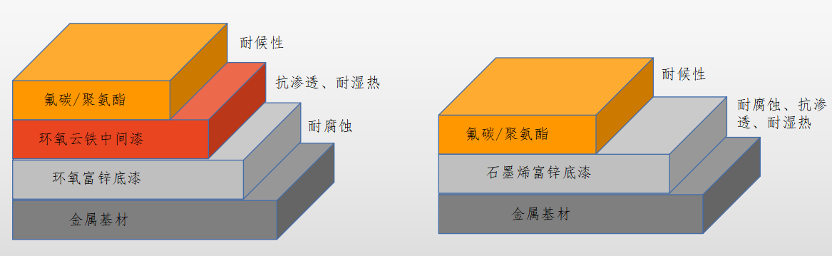 圖1. 傳統(tǒng)環(huán)氧富鋅三涂層體系 VS 石墨烯鋅雙涂層體系