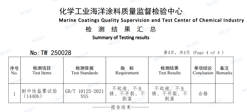 檢測(cè)結(jié)果顯示:湖南夢(mèng)能科技有限公司生產(chǎn)的水性納米隔熱保溫涂料通過了1440h的耐中性鹽霧試驗(yàn)。