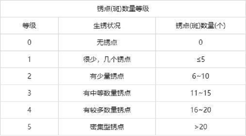生銹的評(píng)價(jià)等級(jí)分為五個(gè)等級(jí),評(píng)定方法:銹點(diǎn)(斑)數(shù)量的等級(jí)和銹點(diǎn)大小的等級(jí)(加括號(hào))。