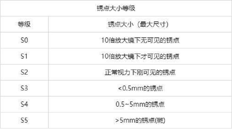 例如:生銹3(S4),表示銹點(diǎn)(斑)的數(shù)量等級(jí)為3級(jí),銹點(diǎn)大小等級(jí)為S4級(jí)