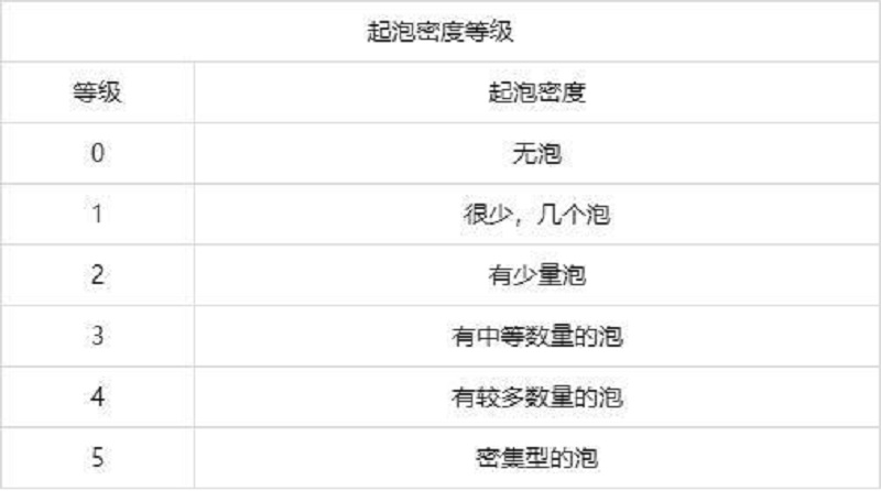 起泡等級(jí)的評(píng)定方法:起泡密度等級(jí)和起泡大小等級(jí)(加括號(hào))。