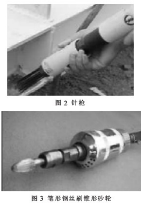 應(yīng)用噴砂、掃砂、砂輪機(jī)修磨等通用方法處理表面,采用鉗工過(guò)扣解決螺紋孔去銹,既消耗人力物力,又隱藏質(zhì)量隱患。 對(duì)死角、凹窩、小孔、邊緣進(jìn)行除銹、噴砂前預(yù)處理表面、涂層返修等重要過(guò)程,均需要專(zhuān)用的工具。 圖2、圖3為兩種典型的表面處理工具。
