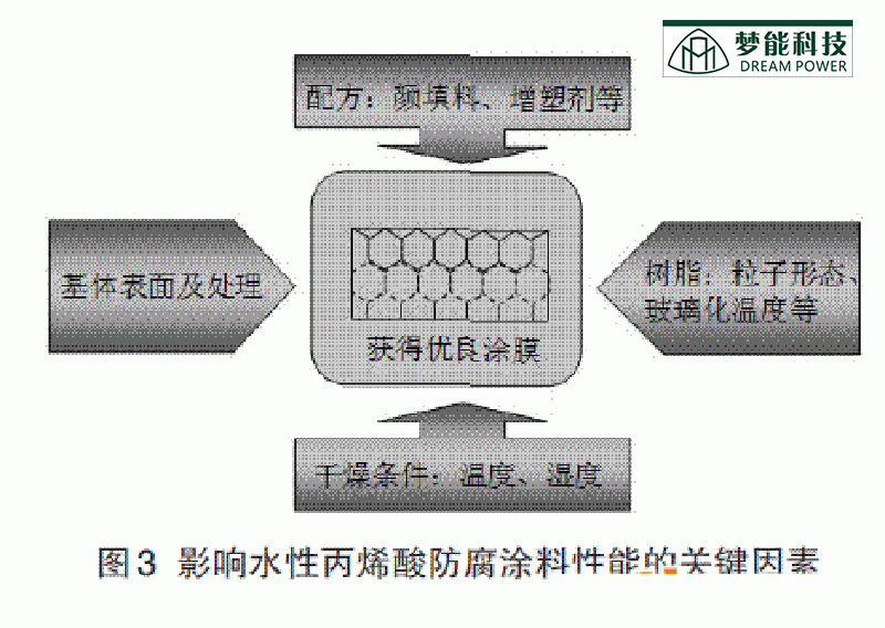 為得到性能良好的水性丙烯酸防腐涂料以及避免涂膜過早失效,在制備丙烯酸乳液時(shí)應(yīng)盡可能考慮多方面因素對(duì)涂膜產(chǎn)生的影響(圖3),例如選擇性能優(yōu)良的丙烯酸樹脂作為成膜物質(zhì)、選擇合適的配方以及對(duì)基體表面進(jìn)行良好的處理等。