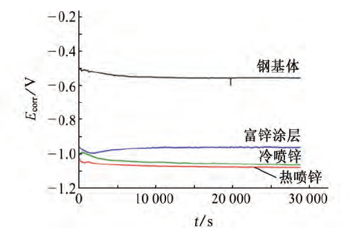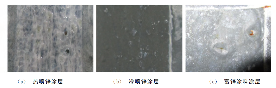 (1) 熱噴鋅、冷噴鋅和富鋅涂料涂層的平均厚度為75~80μm, 熱噴鋅涂層厚度離散性大, 表面粗糙度高, 冷噴鋅和富鋅涂料涂層厚度均勻。三種涂層腐蝕電位均遠(yuǎn)負(fù)于基體的腐蝕電位, 熱噴鋅涂層的腐蝕電位和冷噴鋅涂層的相當(dāng), 富鋅涂料涂層的腐蝕電位略高。