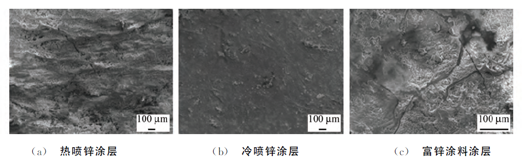 表1給出了三種涂層厚度測(cè)試結(jié)果。從表1可以看出:三種涂層的平均厚度均為75~80μm,沒(méi)有明顯區(qū)別。而熱噴鋅涂層厚度離散性很大, 最小為50μm, 最大為107μm;富鋅涂料涂層和冷噴鋅涂層最小厚度約為65μm, 明顯高于熱噴鋅涂層的最小厚度 (50μm) 。涂層的耐蝕性不僅僅取決于其平均厚度, 更取決于涂層的最小厚度和涂層致密性。涂層失效一般開(kāi)始于缺陷處或耐蝕性最差處。涂層的最小厚度越小, 發(fā)生失效時(shí)間越短。涂層致密性越差, 腐蝕介質(zhì)越容易滲透涂層到達(dá)基體, 腐蝕也就越快。在平均厚度相當(dāng)時(shí), 熱噴鋅涂層的最小厚度較小, 粗糙度較大, 故其耐蝕性較差。