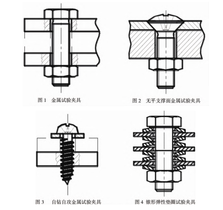 (1) 平行面支撐法:試驗應(yīng)在相適應(yīng)的夾具上進(jìn)行,試驗夾具的硬度應(yīng)該大于 45 HRC,取螺栓或螺釘按照圖1~4所示進(jìn)行裝夾,緊固件承受的應(yīng)力應(yīng)在其屈服點以內(nèi)或者在破壞扭矩范圍內(nèi),將試驗配件夾好后保持載荷不變持續(xù)48小時,并進(jìn)行檢測,每隔一天扭動夾具回到初始應(yīng)力處,并檢測金屬配件是否受到破壞。