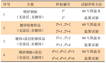 在現(xiàn)場(chǎng)光伏大規(guī)模試驗(yàn)的同時(shí),為驗(yàn)證桁架防腐方案的可靠性,使用桁架截取的小樣和同材質(zhì)試驗(yàn)鋼板進(jìn)一步對(duì)防腐效果進(jìn)行試驗(yàn)評(píng)價(jià)。試驗(yàn)方案如表3所示。