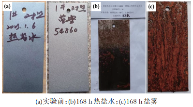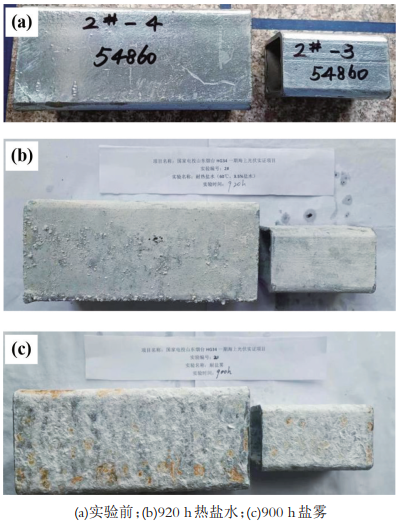 試驗(yàn)所用鍍鋅小樣為現(xiàn)場(chǎng)桁架截取,鍍鋅厚度為105μm;3#鍍鋅+涂層設(shè)計(jì)為105μm鍍鋅層、60μm鍵合型環(huán)氧連接漆、120μm鍵合型環(huán)氧中間漆、80μm高耐候脂肪族聚氨酯面漆;4#涂層設(shè)計(jì)為80μmJ專用環(huán)氧底漆、200μm鍵合型環(huán)氧中間漆、80μm高耐候脂肪族聚氨酯面漆。試驗(yàn)中,耐熱鹽水試驗(yàn)環(huán)境為60℃、3.5%氯化鈉溶液,耐鹽霧試驗(yàn)環(huán)境為鹽霧試驗(yàn)箱中標(biāo)準(zhǔn)鹽霧環(huán)境。鍍鋅+涂層方案以及涂層方案實(shí)驗(yàn)依據(jù)JTS153-2015《水運(yùn)工程結(jié)構(gòu)耐久性設(shè)計(jì)標(biāo)準(zhǔn)》設(shè)計(jì)。
