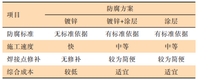 鋼桁架防腐方案中,鍍鋅、鍍鋅+防腐涂層、純涂層3種方案在施工及其他方面的對(duì)比如表5所示。