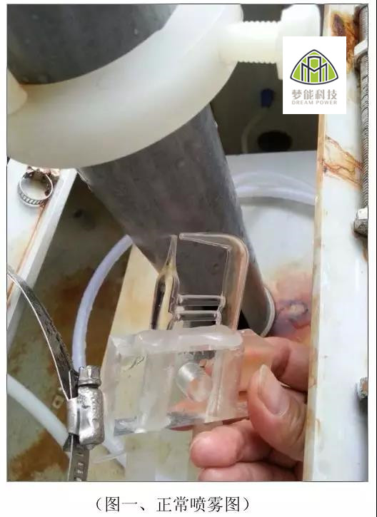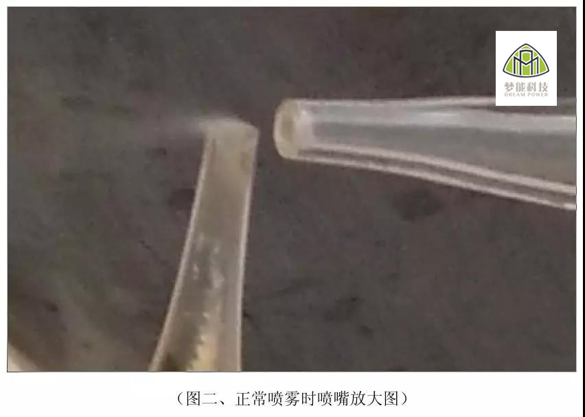 以下通過噴嘴堵塞前后圖片的對(duì)比分析不噴霧的根本原因。圖一為清潔后正常噴霧時(shí)的圖片,圖二為正常噴霧時(shí)的噴嘴放大圖片。