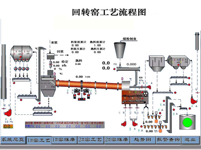 我們僅以濕法回轉(zhuǎn)窯工藝做以介紹和分析。濕法回轉(zhuǎn)窯窯體通常比較長(長徑比為30~40),為增加窯的傳熱面積,常在窯尾分掛有鏈條,加速水分蒸發(fā)。濕法回轉(zhuǎn)窯生產(chǎn)時在生料磨中加入水,將生料制成含水為30%~40%的料漿,經(jīng)均化達到要求的料漿由窯頭喂料機送入窯內(nèi)煅燒成熟料,出窯熟料經(jīng)冷卻機冷卻,送入熟料庫,原煤經(jīng)烘干兼粉磨成煤粉后再燃燒供給給熟料煅燒所需熱量。