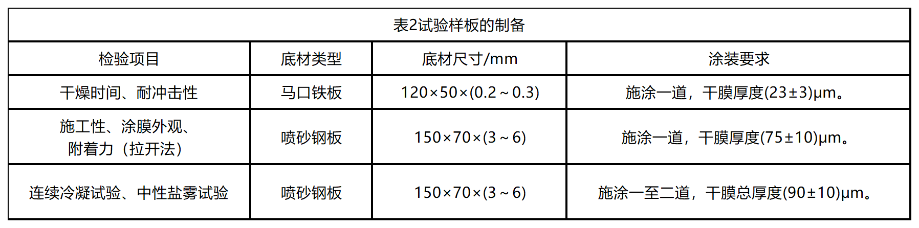除非另有商定,按表2的規(guī)定制備試驗(yàn)樣板。采用與本標(biāo)準(zhǔn)規(guī)定不同的樣板制備方法和干膜厚度應(yīng) 在檢驗(yàn)報(bào)告中注明。