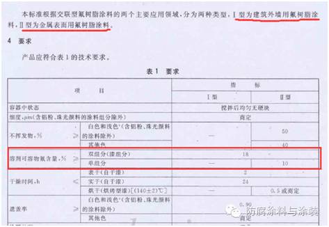 在氟化工行業(yè)標(biāo)準(zhǔn)HG/T3792—2005交聯(lián)型氟樹脂涂料中,規(guī)定的雙組份氟碳涂料的溶劑可溶物氟含量≥18%。(如下圖)