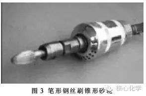 應(yīng)用噴砂、掃砂、砂輪機(jī)修磨等通用方法處理表面,采用鉗工過扣解決螺紋孔去銹,既消耗人力物力,又隱藏質(zhì)量隱患。對(duì)死角、凹窩、小孔、邊緣進(jìn)行除銹、噴砂前預(yù)處理表面、涂層返修等重要過程,均需要專用的工具。圖2、圖3為兩種典型的表面處理工具。