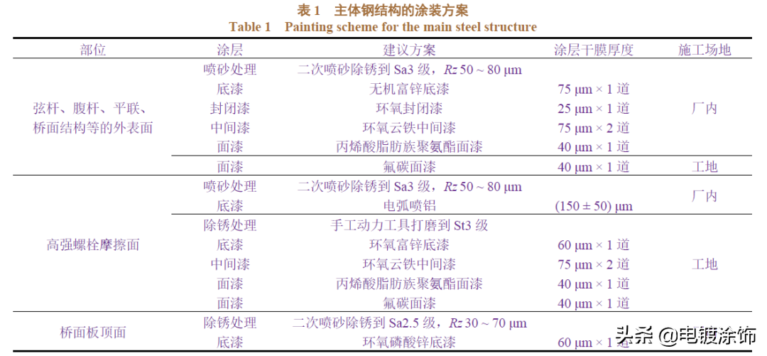 根據(jù)橋梁所處環(huán)境、設(shè)計(jì)要求和橋梁的結(jié)構(gòu)部位,結(jié)合相關(guān)理論JT/T 722–2008《公路橋梁鋼結(jié)構(gòu)防腐涂裝技術(shù)條件》及GB 50205–2017《鋼結(jié)構(gòu)工程施工質(zhì)量驗(yàn)收規(guī)范》的要求來為主體鋼結(jié)構(gòu)選定表1所示的長效型涂裝方案,其中耐候性面漆的顏色按全橋景觀設(shè)計(jì)要求來確定。