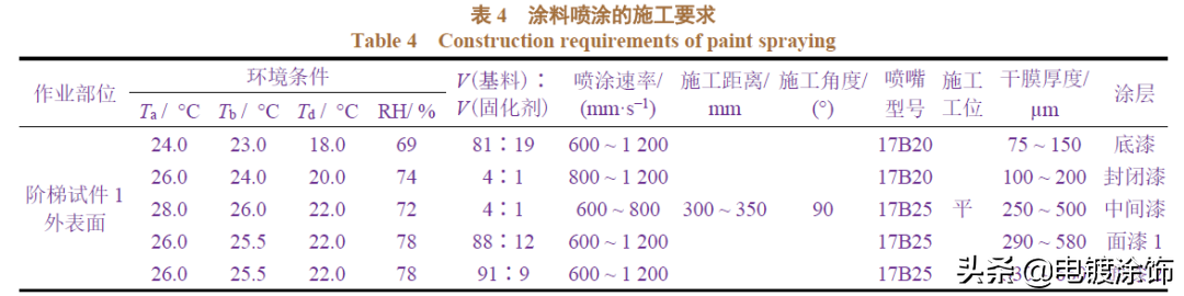 選取涂有車間底漆(醇溶性無機(jī)硅酸鋅)的試板(厚度為14 mm),漆膜厚度選用上限,即25 μm。施工前,通過試驗(yàn)確認(rèn)表面處理及噴涂的工藝參數(shù),為后續(xù)施工及批量涂裝生產(chǎn)提供有效的技術(shù)依據(jù)。