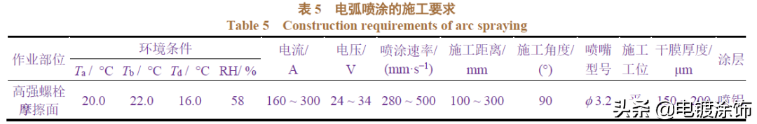 采用十字噴涂法進(jìn)行電弧噴鋁,通過調(diào)節(jié)施工參數(shù)來做到鋁層顆粒細(xì)小,以降低鋁層的孔隙率。摩擦面涂裝范圍從孔群最外側(cè)螺栓孔壁外延80 mm,要做到摩擦面、噴涂面規(guī)整,無波浪邊。