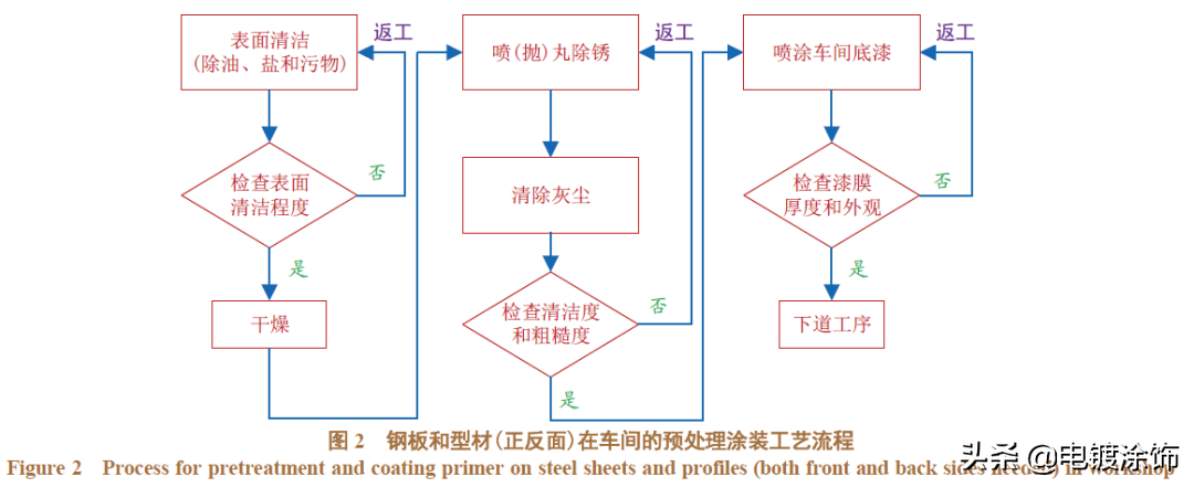 在鋼材預(yù)處理流水線上完成鋼板和各種型材的預(yù)處理,表面除銹達(dá)到GB 8923規(guī)定的Sa2.5級,Rz 30 ~ 70 μm,并噴涂一道車間底漆以防止鋼材在加工過程中銹蝕。