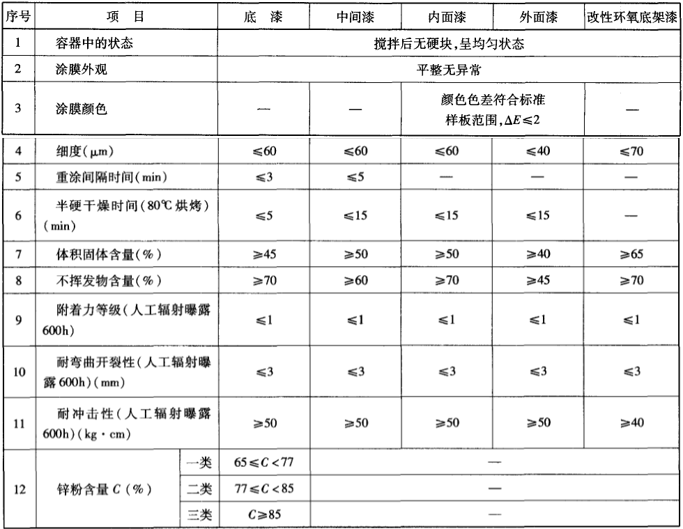 產(chǎn)品應規(guī)定儲存條件。在規(guī)定的儲存條件下,有效儲存富鋅底漆不少于6個月,其他涂料不少于12個月。