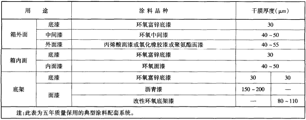 集裝箱底架一般采用兩層涂膜的涂裝配套,底漆為環(huán)氧富鋅底漆,面漆可選用改性環(huán)氧底架漆或瀝青漆等。典型涂料配套見表。
