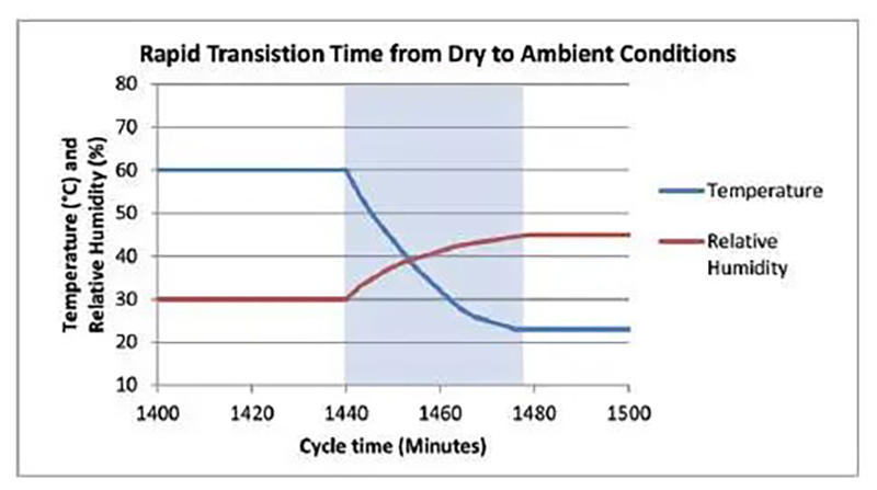濕/干過渡時間十分重要,只有結合可調整轉換時間時,可控相對濕度才有效。GMW 14872試驗需要轉換時間緩慢、呈線性,而其他方法需要“盡快”上升或使轉換時間最小化。現代腐蝕試驗箱可供用戶進行編程,使控制參數呈線性變化或使轉換時間最小化(參見下圖),并能調整以改變腐蝕樣片的質量損失。