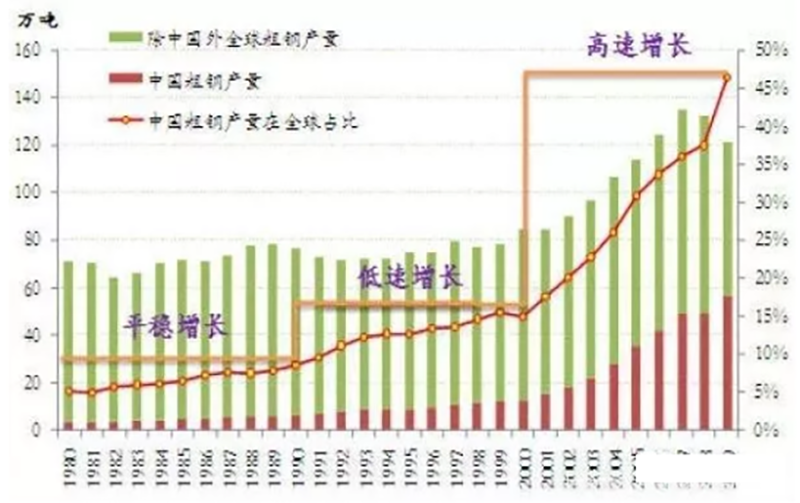 2.迅速崛起時期:改革開放以來延續(xù)到2012年,這個階段我國的鋼鐵產(chǎn)業(yè)迅速崛起、1996年,我國鋼產(chǎn)量超過1億噸,居世界首位。此后,我國鋼鐵產(chǎn)量持續(xù)上升。2000-2007年間,我國鋼鐵產(chǎn)量平均年增長率超過20%,2008年的產(chǎn)量更是超過了5億噸。