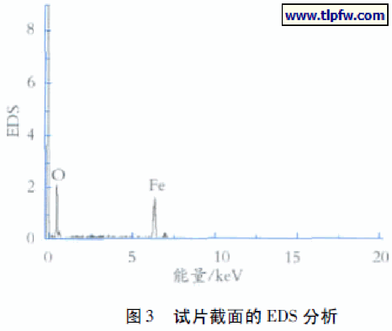 鋼結(jié)構(gòu)表面涂裝的長效防腐涂層在洞室高濕環(huán)境存放幾年后,涂層會(huì)發(fā)生起泡破損等現(xiàn)象( 如圖1 所示) ,各涂層多處局部發(fā)生顯著腐蝕、脫落,嚴(yán)重處露出基體。對(duì)同時(shí)存放的試片鼓泡處進(jìn)行切割取樣,對(duì)其截面進(jìn)行微觀分析,SEM 照片和EDS 分析如圖2、圖3 所示,在涂層與基體之間發(fā)現(xiàn)了腐蝕產(chǎn)物,能譜分析為Fe 的氧化物。