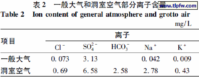 通過洞室環(huán)境裂隙水質(zhì)分析( 如表1 所示) 和空氣冷凝水離子含量分析( 如表2 所示) 發(fā)現(xiàn),洞室裂隙水中Cl -、SO42 -、HCO3- 的含量遠(yuǎn)大于當(dāng)?shù)卮髿饨邓邢鄳?yīng)離子含量,當(dāng)?shù)卮髿饨邓诹严稘B流過程中,不斷與所接觸的地質(zhì)介質(zhì)發(fā)生離子交替并溶解其鹽分,使水中離子含量增大。裂隙水滲流入洞室后,使洞室環(huán)境空氣中主要離子的含量均與一般大氣差別甚遠(yuǎn),