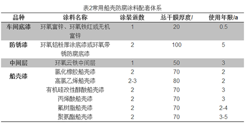 該區(qū)域涂料主要受海水、霧、海風的侵蝕,氣溫變化、日光照射的影響,從而加速漆膜的失光、粉化,甚至開裂脫落,目前主要以三涂層體系為主,底漆有環(huán)氧富鋅底漆、無機富鋅底漆、水性無機富鋅底漆、環(huán)氧磷化底漆、磷化底漆;中間層為環(huán)氧云鐵防腐涂料、無涂裝間隔的改性環(huán)氧涂料;耐候面漆有有機硅改性醇酸、氯化橡膠、單組分丙烯酸、可復涂丙烯酸聚氨酯、氟碳涂料。依據(jù)不同的防腐年限,采用不同的配套涂料體系,一些配套涂料體系經(jīng)實船試驗有10a以上的防腐期效。目前國外的發(fā)展趨勢為長效、環(huán)保、施工道數(shù)少、采用二涂層體系代替?zhèn)鹘y(tǒng)的三涂層體系,如美國PSX系列雜化硅環(huán)氧、雜化硅丙烯酸系列,目前各大型艦船涂料制備公司都開始推出相應的產(chǎn)品。此類涂料可減少施工道數(shù)、降低施工過程中的溶劑揮發(fā)、有更高的耐候性,涂料的綜合性價比較三涂層丙烯酸聚氨酯體系有較大的優(yōu)勢。目前的傳統(tǒng)三涂層配套體系見表2。