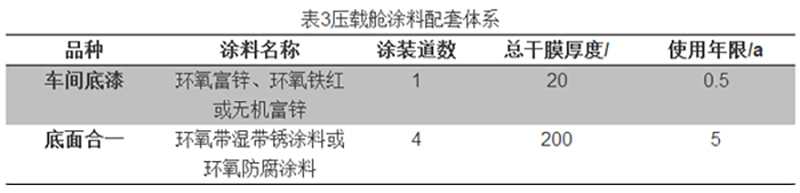 液艙包括壓載艙、飲水艙、燃油艙、液體貨艙。對于壓載艙,2004年11月由波羅的海和國際海事理事會、國際船級社協(xié)會、國際航運工會、國際干貨船船東協(xié)會聯(lián)合向國際海事組織提出(壓載艙的保護涂層的性能標準草案)要求:1、保護涂層系統(tǒng)的目標使用壽命為15a;2、環(huán)氧涂料的干膜厚度不小于300μm,建議使用無或低VOC的涂料,目前國際大涂料公司推出多種壓載艙涂料,具有高固體分、長壽命、高邊角保持率的特點,國內(nèi)仍以環(huán)氧煤瀝青為主,與國外在涂料品種和施工應用方面差距較大。常用的壓載艙涂料配套體系見表3。