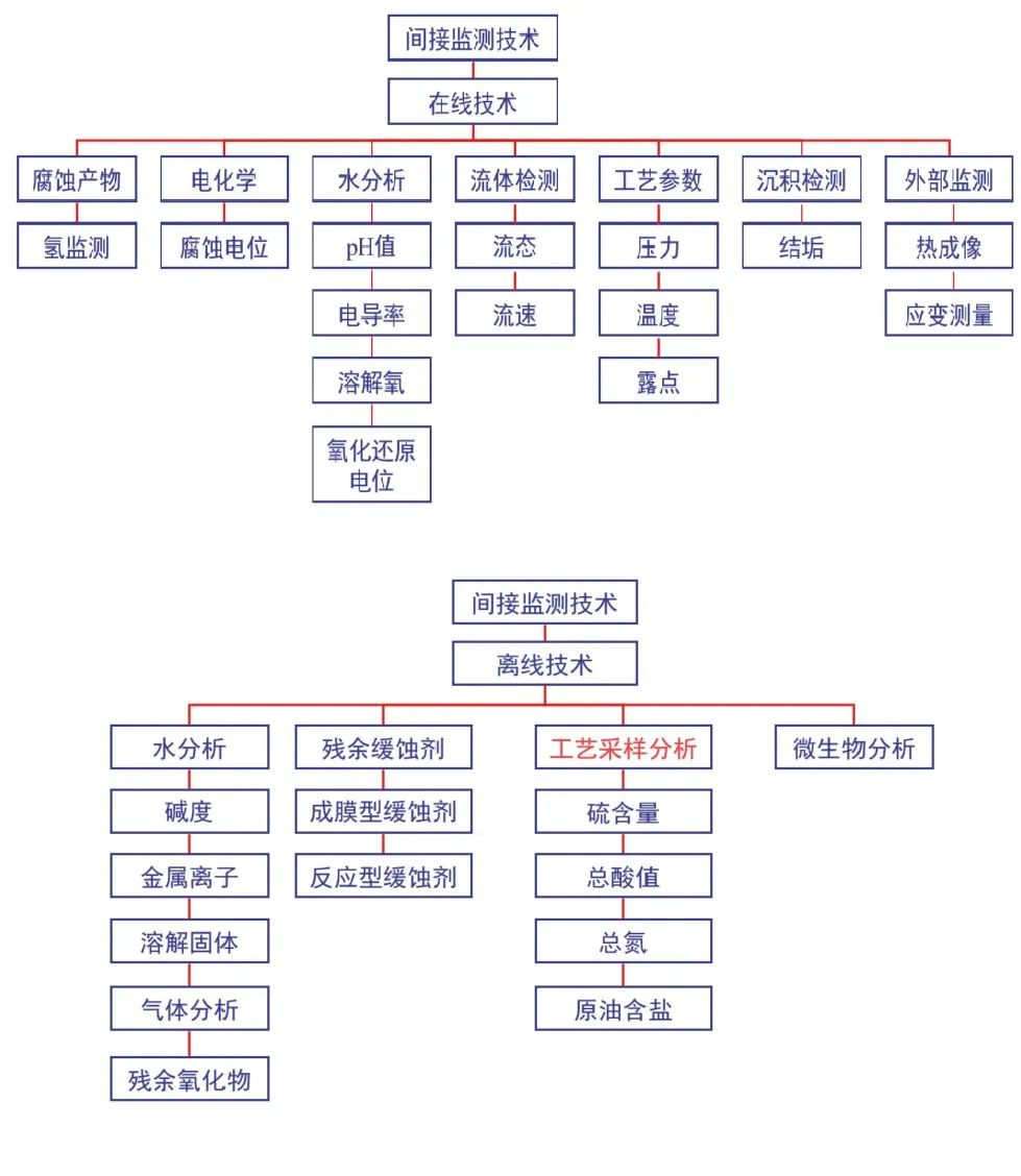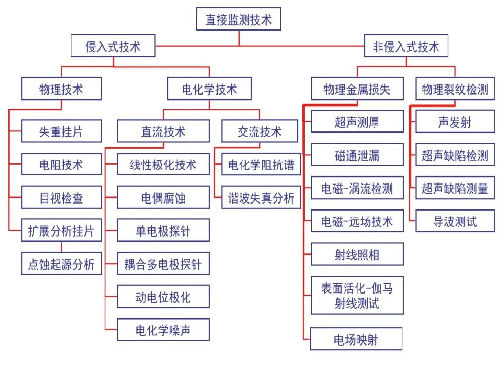 根據(jù)腐蝕監(jiān)測技術(shù)特征,可以分為直接監(jiān)測技術(shù)和間接監(jiān)測技術(shù),直接監(jiān)測技術(shù)測量的是因腐蝕或沖蝕而出現(xiàn)直接變化的參數(shù);而間接監(jiān)測技術(shù)測量的是那些影響腐蝕或沖蝕,或受腐蝕或沖蝕影響而出現(xiàn)變化的參數(shù)。其中直接監(jiān)測技術(shù)又分為侵入式技術(shù)和非侵入式技術(shù)兩類,間接監(jiān)測技術(shù)分為在線技術(shù)和離線技術(shù)兩類。侵入式技術(shù)是指需要穿過管線或容器外壁,直接接觸到內(nèi)部介質(zhì)進行測量的技術(shù),一般來說,侵入式技術(shù)需要特定形式的探針或測試片;間接監(jiān)測技術(shù)可以是在線或離線的,對于在線技術(shù)而言,不需要將設(shè)備從工藝過程中移除,而離線技術(shù)則需要從工藝過程中采集樣品或試片進行分析。根據(jù)以上分類,對目前存在的腐蝕監(jiān)測技術(shù)進行分類劃分,形成技術(shù)體系,分別如圖1、2所示。