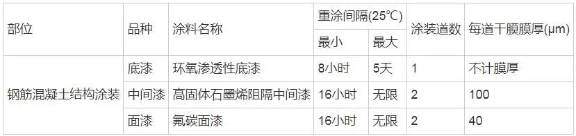 (2)對鋼筋混凝土基材進行全面檢查,對已經(jīng)老化的混凝土表面進行機械打磨,刮膩子找平后進行涂料涂裝。嚴格按照基材前處理—報檢—底漆施工—報檢中間漆施工—報檢—面漆施工—最終驗收的工序,嚴格記錄每道施工情況,發(fā)現(xiàn)有厚度不足及時予以修補,發(fā)現(xiàn)附著力不達標(biāo),及時鏟除重新進行涂裝。