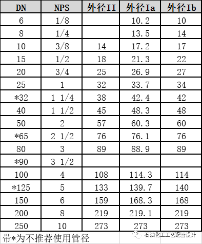 根據(jù)《化工配管用無縫及焊接鋼管尺寸選用系列》(HG/T 20553-2011)中規(guī)定,常用鋼管的外形尺寸摘錄如下: