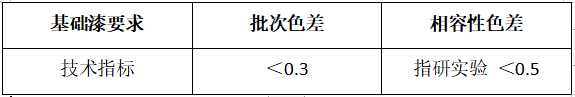 為了得到滿意的最終調(diào)色結(jié)果,使基礎(chǔ)漆對調(diào)色結(jié)果的影響達(dá)到客戶能接受的程度,對基礎(chǔ)漆性能指標(biāo)的要求,列于表1中。