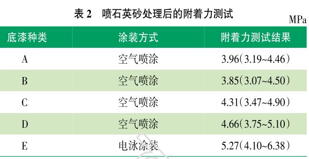 從測(cè)試結(jié)果來(lái)看,噴石英砂處理后的試板噴涂不同的底漆,附著力的測(cè)試結(jié)果不同。D類和E類底漆的附著力偏高,符合客戶的要求;A類、B類及C類底漆的附著力,沒(méi)有達(dá)到客戶的指標(biāo)要求。