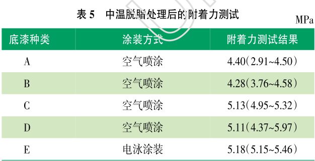 從測(cè)試結(jié)果來(lái)看,中溫脫脂處理后的試板噴涂不同的底漆,附著力的測(cè)試結(jié)果不同。C類、D類和E類底漆的附著力偏高,符合客戶的要求;A類和B類底漆的附著力偏低,沒(méi)有達(dá)到客戶的指標(biāo)要求。