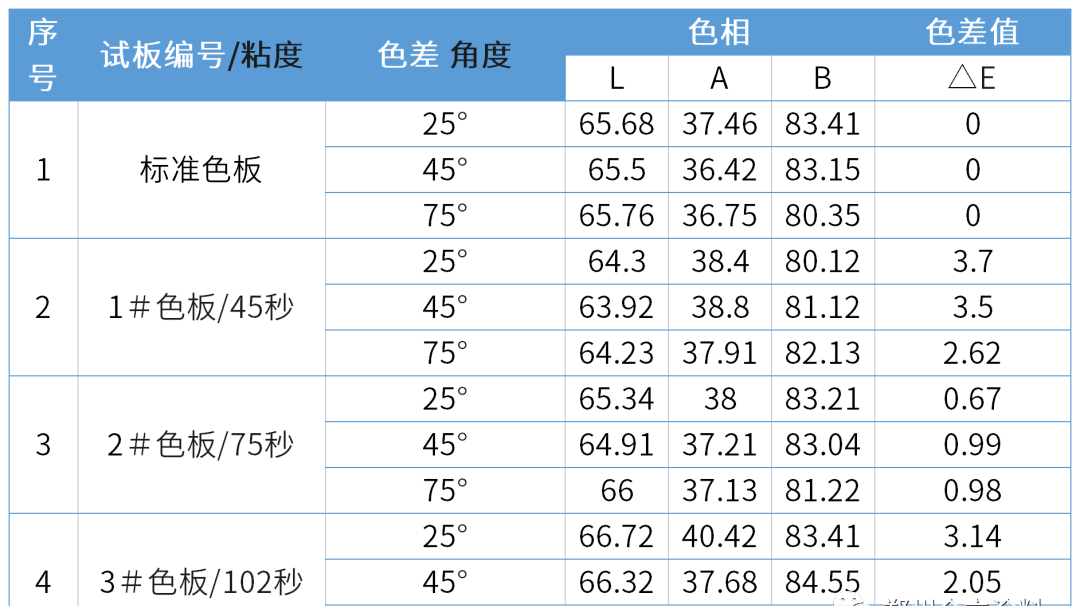 施工黏度對(duì)色差也有影響。同一種漆,采用不同的黏度進(jìn)行施工,獲得涂層的色差值是不一樣的,而且差別很大。這是因?yàn)槭┕ゐざ扔绊懫崮さ耐庥^質(zhì)量所致。取某公司“工程黃”水性面漆噴涂不同黏度的色板,其中1#色板黏度45 s、2#色板黏度75 s、3#色板黏度102 s時(shí),進(jìn)行色差效果比較,對(duì)照結(jié)果見(jiàn)下表。