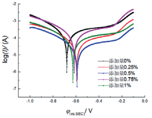 在不同石墨烯添加量的條件下對(duì)漆膜進(jìn)行塔菲爾試驗(yàn),對(duì)腐蝕電流和腐蝕電位進(jìn)行對(duì)比,結(jié)果見(jiàn)圖4。