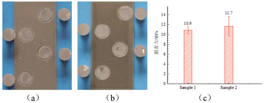 圖5 未添加石墨烯(a)和添加5%石墨烯(b)和附著力數(shù)值(c)對(duì)比圖