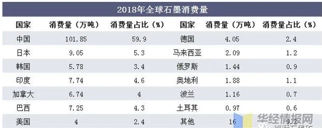 全球石墨消費主要集中在中國、日本、韓國、印度、加拿大、巴西、美國等國家。2018年,消費量居前三的國家為中國(消費量101.85萬噸,占比59.9%)、日本(消費量9.05萬噸,,占比5.3%)、印度(消費量7.74萬噸,占比4.6%)。