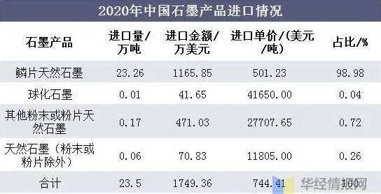 2020年中國石墨產(chǎn)品進口量為23.5萬噸,其中鱗片天然石墨進口量為23.26萬噸,進口金額為1165.85萬美元,進口單價為501.23美元/噸,占據(jù)整個進口量的98.98%。