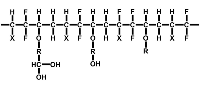 目前,典型的溶劑型氟碳樹(shù)脂主要是FEVE型(氟烯烴和烷基乙烯基醚或氟烯烴和烷基乙烯基酯交互排列的共聚) 氟碳樹(shù)脂,分子結(jié)構(gòu)見(jiàn)圖,引入新的基團(tuán),增加了樹(shù)脂在溶劑中的溶解性能: