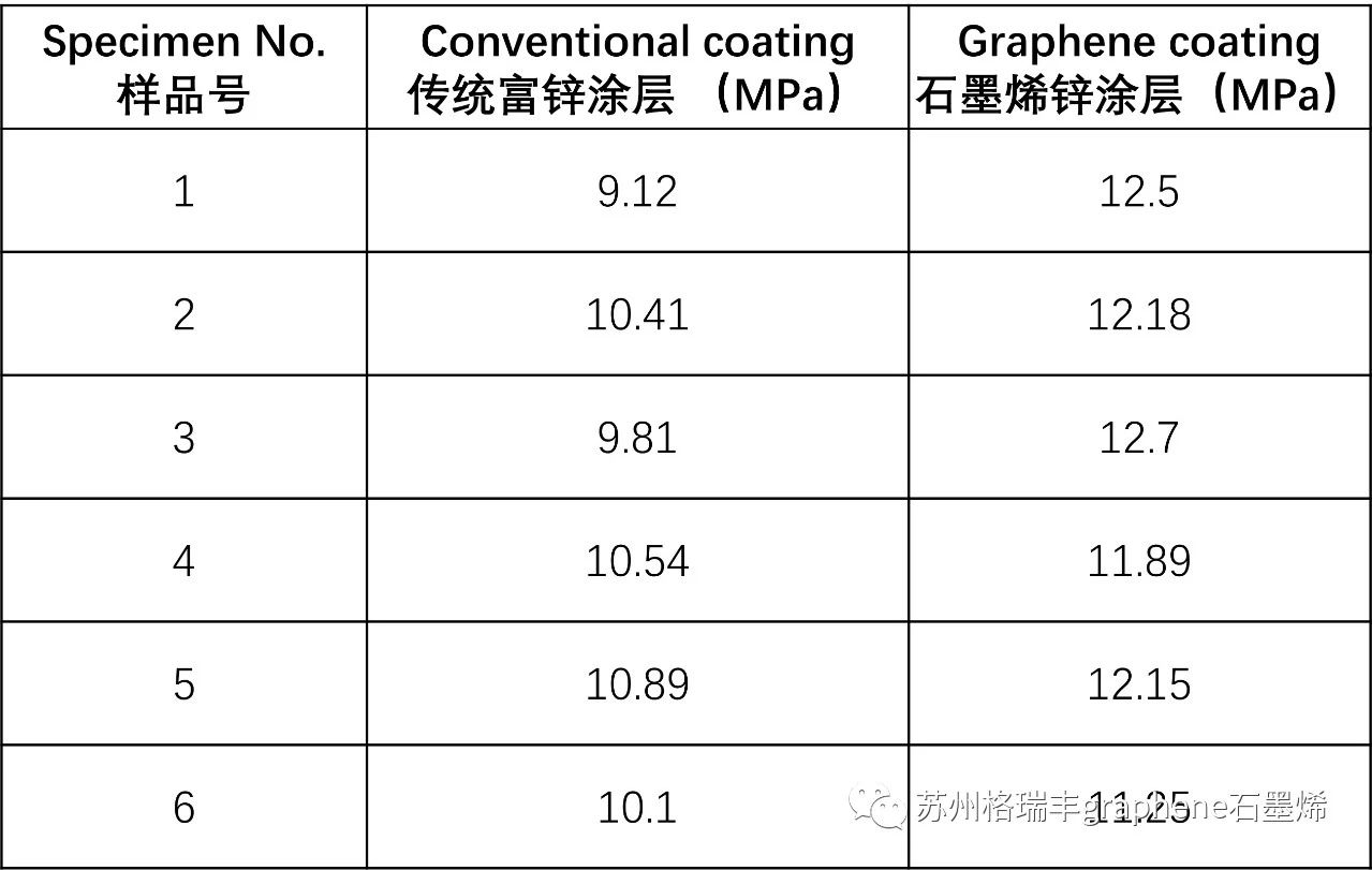 表1示出了6組常規(guī)涂層和石墨烯涂層的附著力。從表1中可以看出,石墨烯涂層的最大附著力達(dá)到了12.5 MPa,總體平均附著力則達(dá)到了12.1 MPa,明顯大于常規(guī)涂層10.2 MPa的平均附著力,平均附著力提升了約20%。
