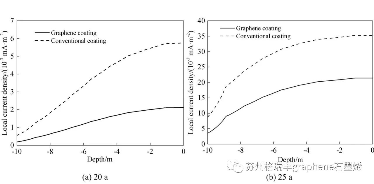 圖1示出了20 a和25 a時(shí)石墨烯涂層與常規(guī)涂層(i0=4×10-5 A/m2)作用下鋼管樁表面的局部電流密度,即腐蝕速率.在第20 a時(shí),犧牲陽(yáng)極未完全消耗殆盡,犧牲陽(yáng)極作為電位較低的合金材料,使得鋼管樁成為陰極材料,其與鋼管樁之間的電位差產(chǎn)生一定強(qiáng)度的電流使得鋼管樁受到保護(hù),鋼管樁局部電流密度處于較低水平。在第25 a時(shí),犧牲陽(yáng)極已全部消耗,鋼管樁的腐蝕速率相較于第20 a時(shí)的腐蝕速率有較大的提高,如在海平面處,對(duì)于石墨烯涂層和常規(guī)涂層而言,鋼管樁的腐蝕速率均提高了兩個(gè)數(shù)量級(jí)。此外由圖可知,泥面處的腐蝕速率較慢。使用石墨烯涂層可顯著減小鋼管樁的腐蝕速率.在20 a時(shí),石墨烯涂層和常規(guī)涂層防護(hù)下鋼管樁在海平面處的腐蝕速率分別為2.13×10-2A/m2和5.75×10-2 A/m2,在25 a時(shí),則分別為0.214 A/m2和0.352 A/m2,可見(jiàn)在20 a和25 a時(shí),石墨烯涂層防護(hù)下的腐蝕速率為常規(guī)涂層防護(hù)下的37%和61%,這體現(xiàn)出了石墨烯涂層和犧牲陽(yáng)極聯(lián)合防護(hù)的重要作用。